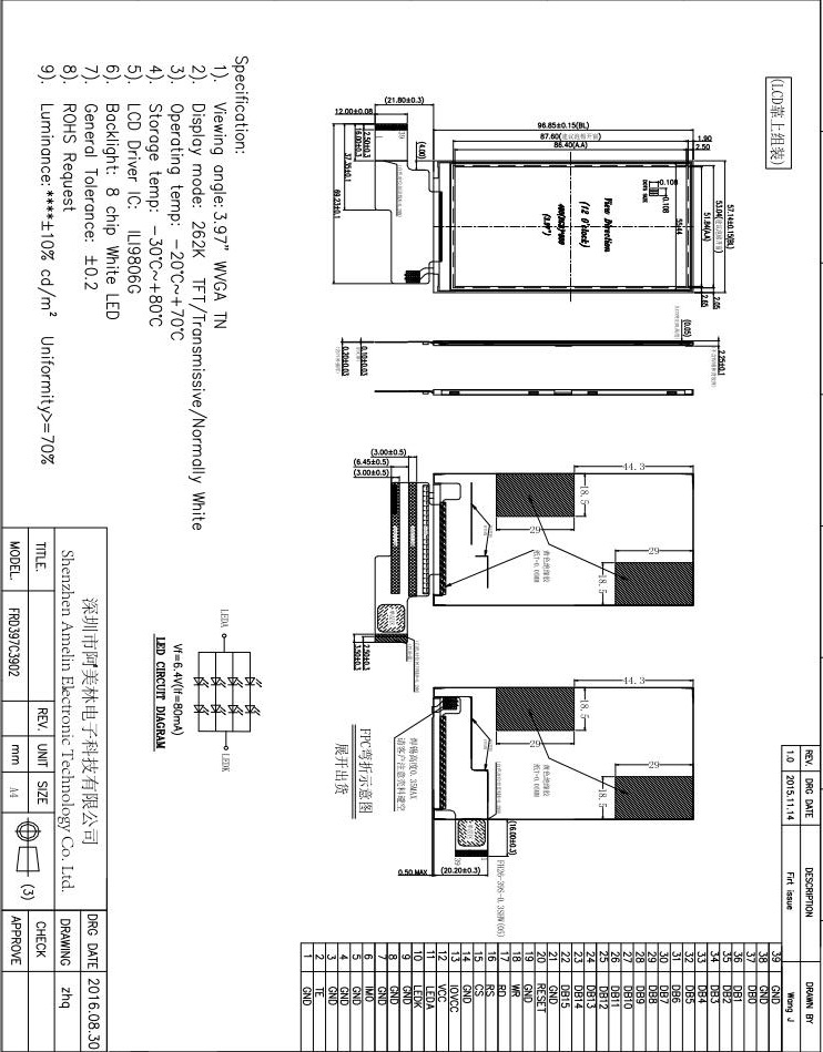 4寸480*800分辨率 TFT电阻触摸屏MCU接口可带TP触摸TN型液晶